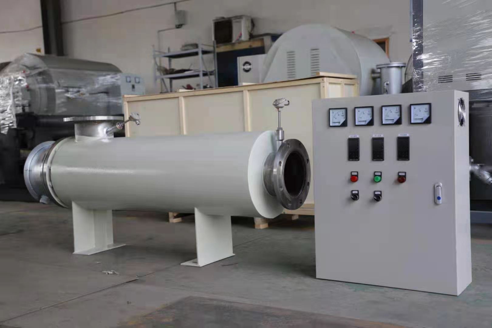 空氣加熱器主要對(duì)氣體流進(jìn)行加熱的電加熱設(shè)備??諝饧訜崞鞯陌l(fā)熱元件為不銹鋼電加熱管,加熱器內(nèi)腔設(shè)有多個(gè)折流板(導(dǎo)流板),引導(dǎo)氣體流向,延長(zhǎng)氣體在內(nèi)腔的滯留時(shí)間,從而使氣體充分加熱,使氣體加熱均勻,提高熱交換效率。空氣加熱器的加熱元件不銹加熱管,是在無縫鋼管內(nèi)裝入電熱絲,空隙部分填滿有良好導(dǎo)熱性和絕緣性的氧化鎂粉后縮管而成的。當(dāng)電流通過高溫電阻絲的時(shí)候,產(chǎn)生的熱通過結(jié)晶氧化鎂粉向加熱管表面擴(kuò)散,再傳遞到被加熱空氣中去,以達(dá)到加熱的目的。主要是用來將所需要的空氣流從初始溫度加熱到所需要的空氣溫度可達(dá)850℃。已被廣泛的應(yīng)用到航空航天、兵器工業(yè)、化工工業(yè)和高等院校等許多科研生產(chǎn)試驗(yàn)室。特別適合于自動(dòng)控溫和大流量高溫聯(lián)合系統(tǒng)和附件試驗(yàn)??諝怆娂訜崞魇褂玫姆秶鷮挘嚎梢詫?duì)任何氣體加熱,產(chǎn)生的熱空氣干燥無水份、不導(dǎo)電、不燃燒、無化學(xué)腐蝕性、安全可靠、被加熱空間升溫快(可控)。
